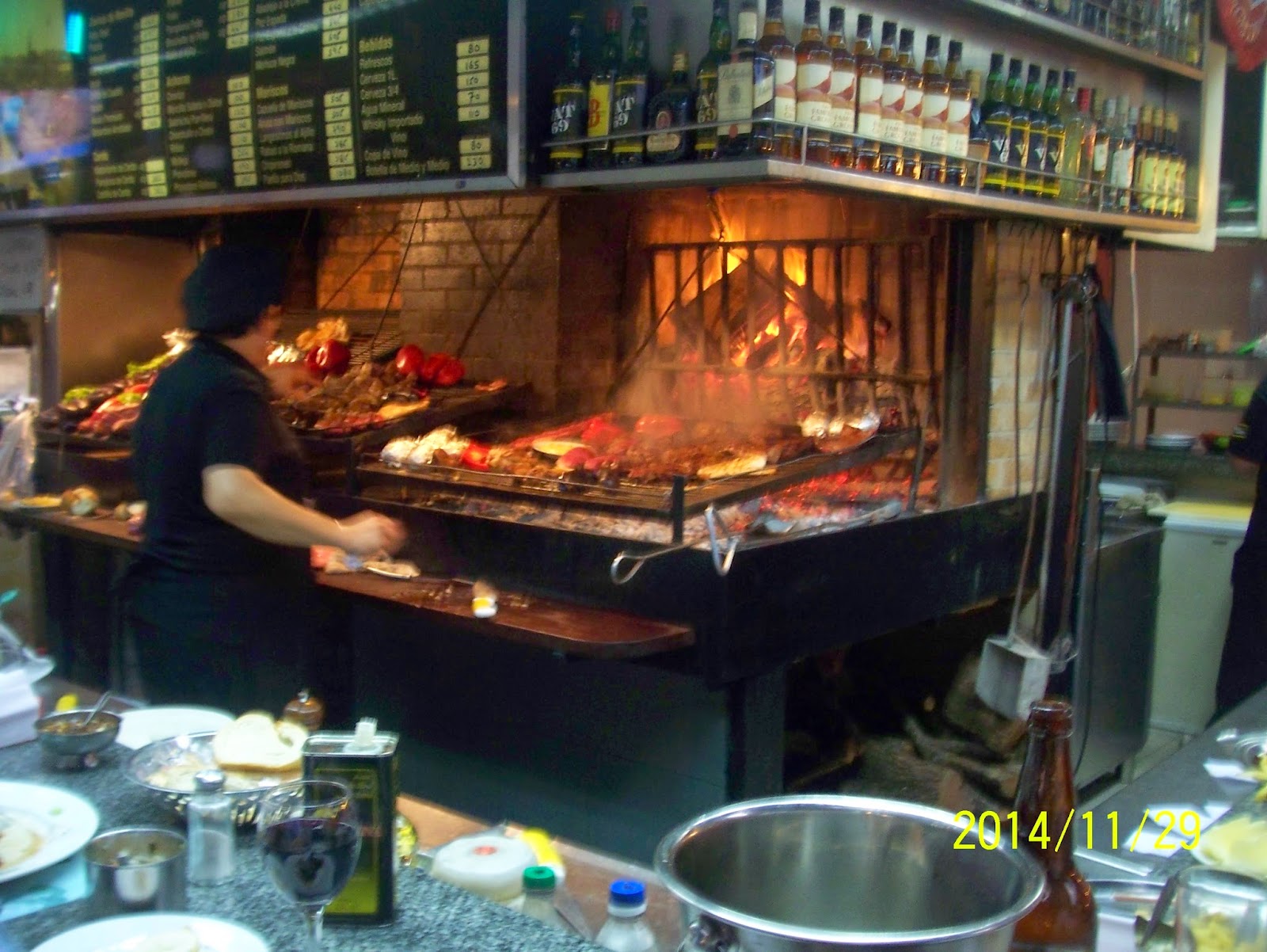 We wisely had decided to have lunch on shore as we heard Uruguayan beef is very good. Well we found this huge grill building. People were eating inside on two levels and outside. There must have been a thousand diners. There were numerous wood/charcoal stoked grills with cooks working hard to keep up. We saw acres of beef, lamb, chicken and pork being cooked to perfection.