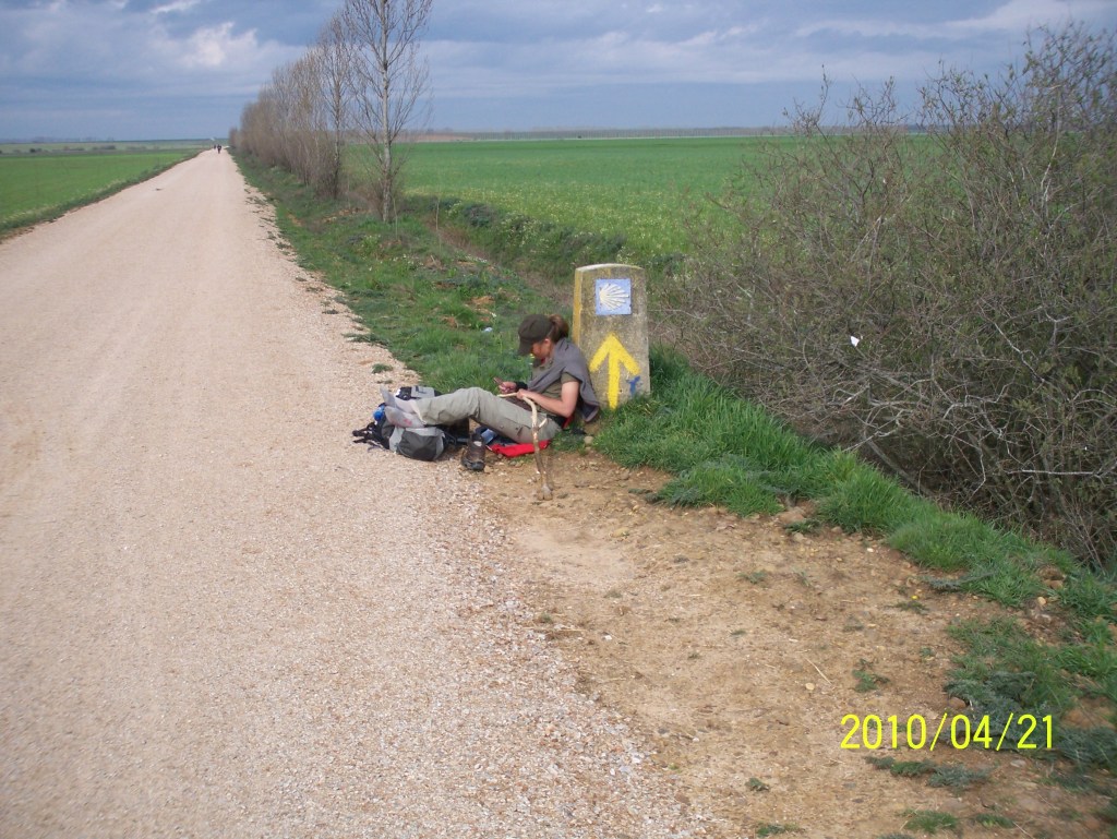 We spent about 30 minutes there reflecting and resting. One of the characters we had met along the way was there with his wife too. I remember he was from Cognac, FR. That may be him pacing in the background above. He had all kinds of equipment that he was fiddling with – an alcohol heater of sorts, a small camping stove, pots and pans, thermoses, etc. He was telling his wife everything. She rolled her eyes a few times and we chuckled. He reminded us of Mr. Bean. Our laugh of the day!