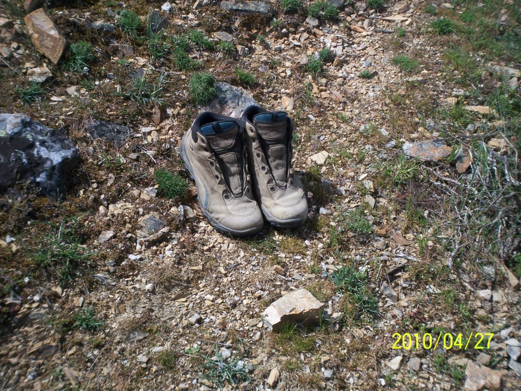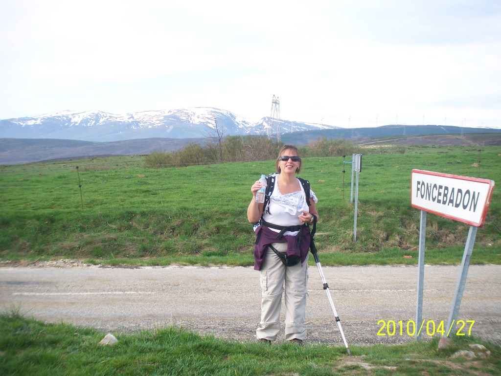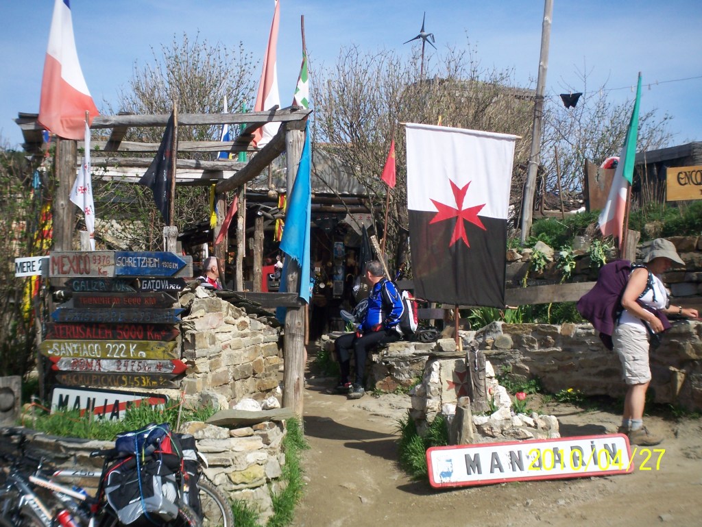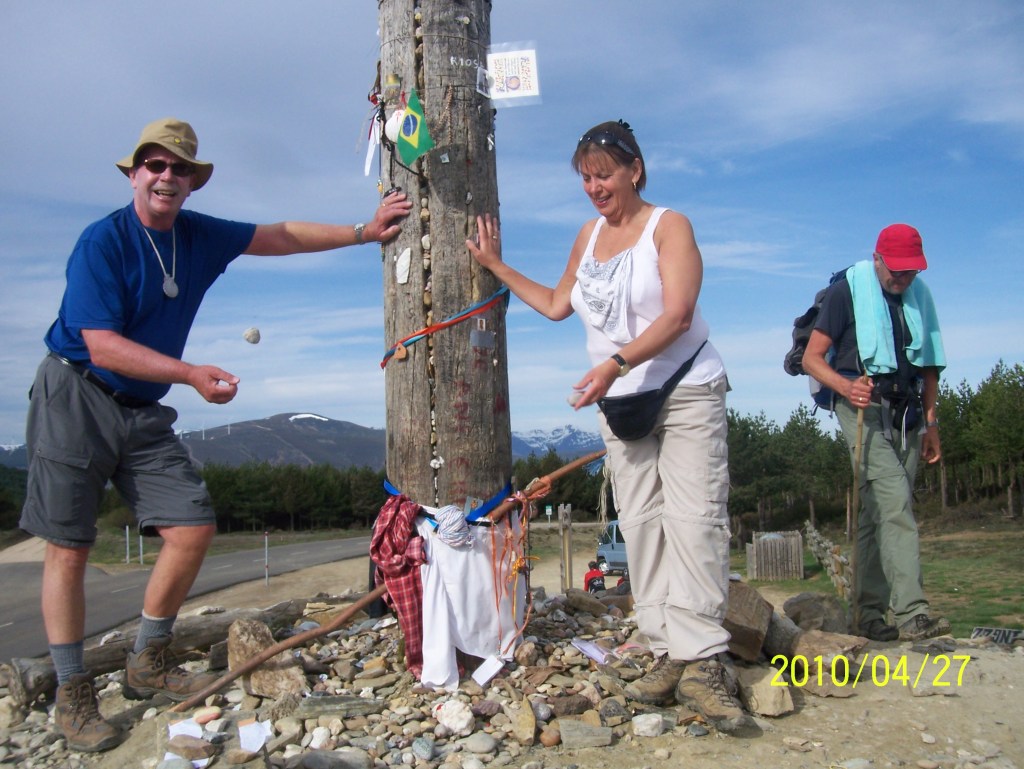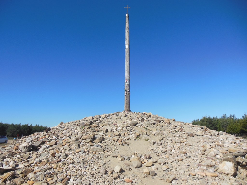 We reached the highest elevation of the entire Camino pilgrimage at La Cruz de Ferro, 1505 m. We walked up a twisty highway to get to the Iron Cross. It consists of a wooden pole with an iron cross at its top. At its base is a mound that has been forming for years. The tradition is to throw a small stone or other object you brought from your home at the base of the cross, either in honour of someone or to let go of something – let go, let God.