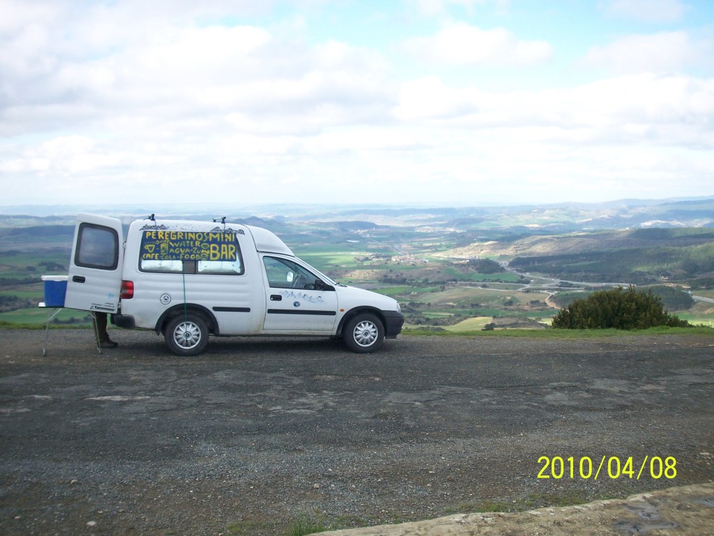 We likely stopped for breakfast but may have had our own snacks. It soon became the norm for us to get up and walk 5 km or more before stopping for a continental breakfast. We then climbed to Alto del Perdon and surprisingly found some warm coffee at a canteen truck at the top. We then gazed back at Pamplona in the distance as we prepared to descend.