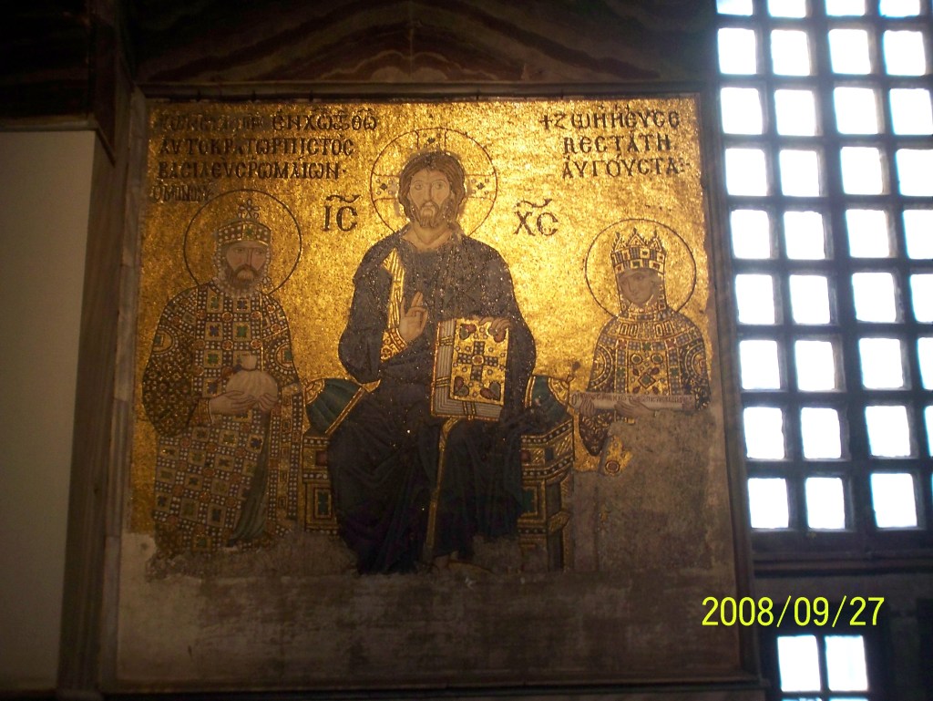 Left: Christ Pantocrator mosaic from the Hagia Sofia, circa 1261, courtesy Wikipedia