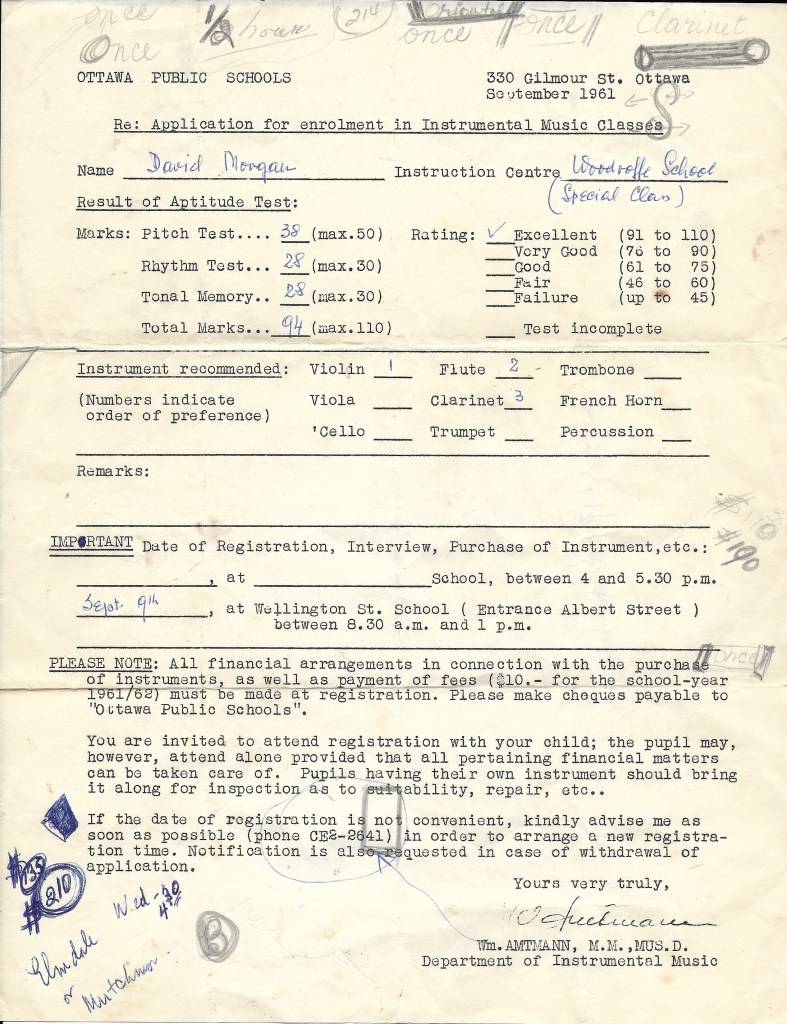 I was a member of the Woodroffe High School (Ottawa, Canada) Band for 3 years way back. I played the flute which happens to figure prominently in the recent concert above. The reason I played flute goes back further. In Grade 6 my mom decided to enroll me in music lessons. I was given an aptitude test and found out I had good aptitude. The results are shown below complete with Mom’s scribbles. It was recommended that I take up the violin. For some reason I abhorred the violin and instead chose the 2nd recommendation, the flute.