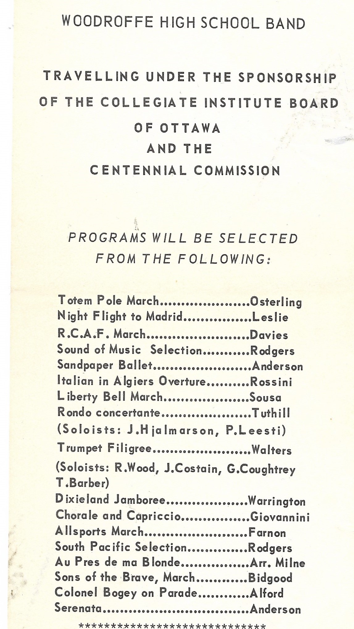 Mayor Don Reid wrote: “The Woodroffe High School Band is one of the leading high school bands in the Province of Ontario. Ottawa is proud of its high school bands, and this particular group of musicians has brought great credit and honour to our city. In their travels across Canada in the summer of 1966 these ambassadors represented not only the Collegiate Institute Board of Ottawa, but also the Nation’s Capital. I have much pleasure in commending to you the efforts and talents of these young people.” Wow!