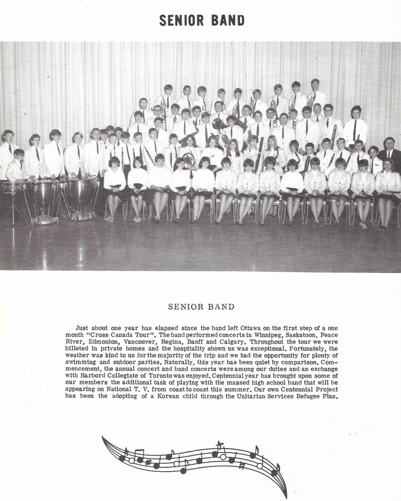 I remember us playing Bobby Gimbi’s “Canada” song throughout 1967 including in front of Prince Philip on Parliament Hill. In Grade 12 I decided to take up the tenor saxophone and gave up my flute position in the band. In Grade 13 I took a full slate of maths and sciences and dropped music completely. It had been a great educational and life experience. I am forever indepted to Mr. Manley and the other music teachers I had for instilling in me a life long love of music, and travelling! My favorite piece remains the finale from Dmitri Shostakovich’s 5th symphony Allegro non troppo, which we played sometimes with great difficulty.