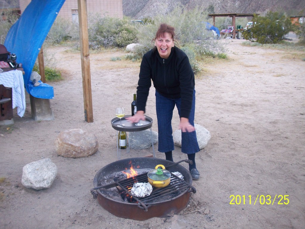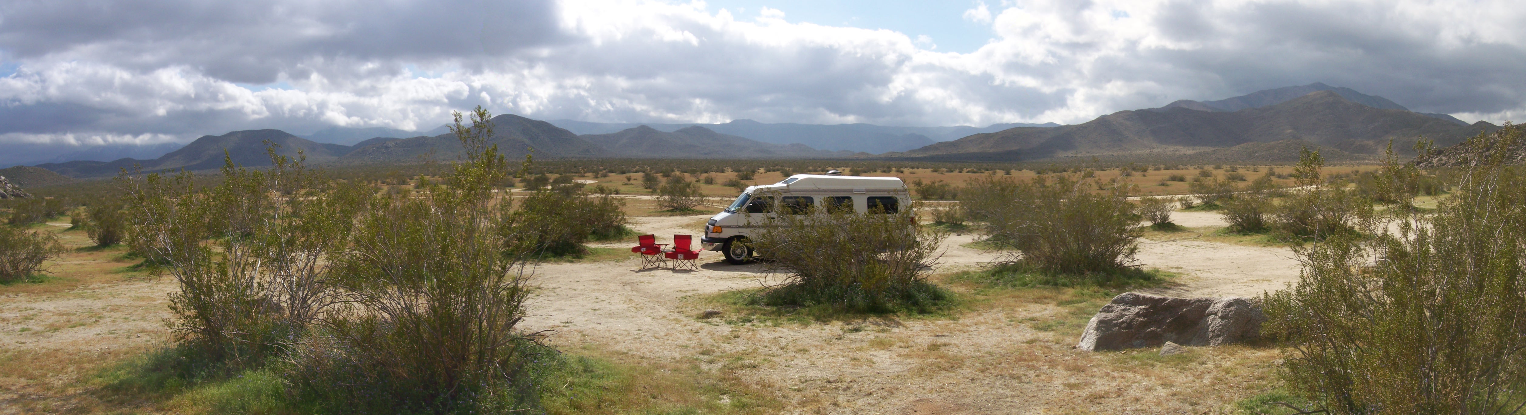 We had had a sneak preview of what to expect with friends Cindy and Marvin. We were anxious to go “boondocking” which means camping off the grid far from the services and amenities provided in RV parks or established campgrounds. We were not sure if it was allowed so after driving down the main street of Borrego Springs we headed out of town for 30 minutes until we found a dirt road and turned on to it. Continuing for another 10 minutes or so we came to a rocky hill with a nice view back towards the valley. We decided to camp right there. Here is what we saw.