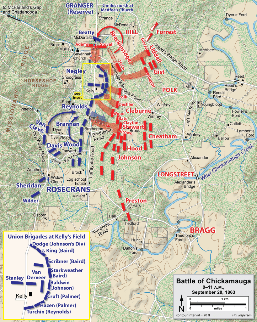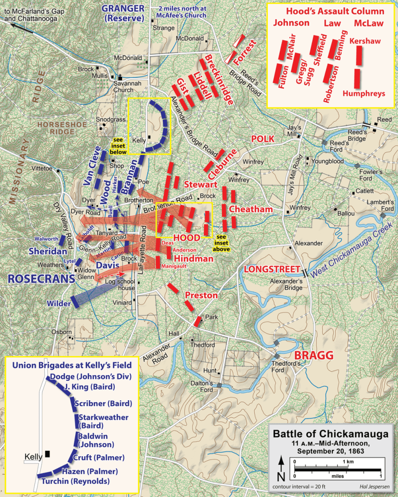 So the order reaches Wood who looks left and sees Brannan is still there so there is no way to link up with Reynolds. But because he had been scolded publically by Rosecrans just that day for not promptly obeying orders, he decides the order must mean to pull back and go behind Brannan and come up behind Reynolds in support. This he does creating an unintentional gap in the Union lines that the order was meant to prevent from happening in the first place. 20 minutes later Longstreet’s Corps by chance is ordered to charge the Union line at the exact spot where Wood had just pulled out of and hence the massive breakthrough.