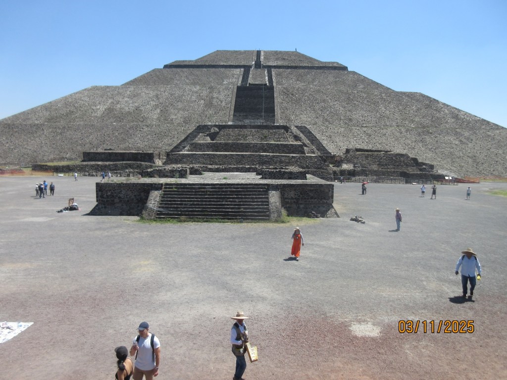Then we visited the amazing pyramids in TeotihuacΓ‘n. There are 3 of them – the sun pyramid; the moon pyramid and the pyramid of death. Built as offerings to the gods, they are very impressive. You canβt climb or go inside them. No one actually lived there; it was a huge religious site. It was very hot with UV index of 13! Dave got a bit faint at one point and Marie reminded him to drink more water which worked.