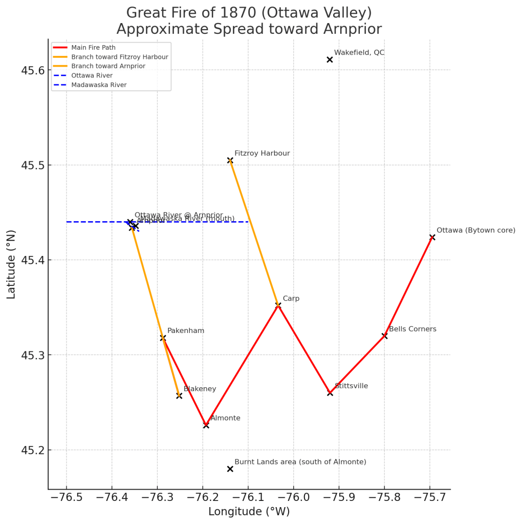 On August 17, 1870, locals woke up to yet another hot day. Since there had been no rain since April, Carleton County was a tinder box. That day, a work gang was clearing brush near Blakeney in the process of extending the rail line right-of-way from Almonte to Pakenham and beyond.