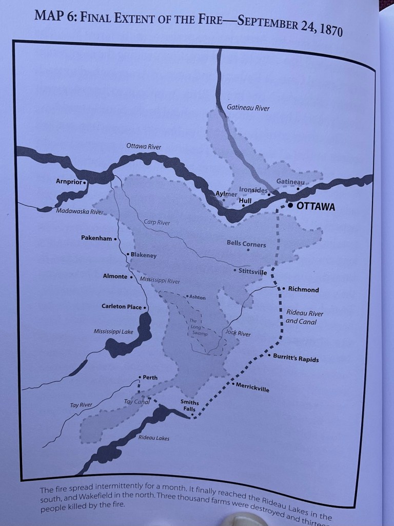 In the aftermath, governments were very stingy in assisting people to rebuild. But gradually, farms and infrastructure were rebuilt until today, you would not know. There is an area south of Almonte called the burnt lands where the soil was burnt down to the limestone. Will have to check this out.